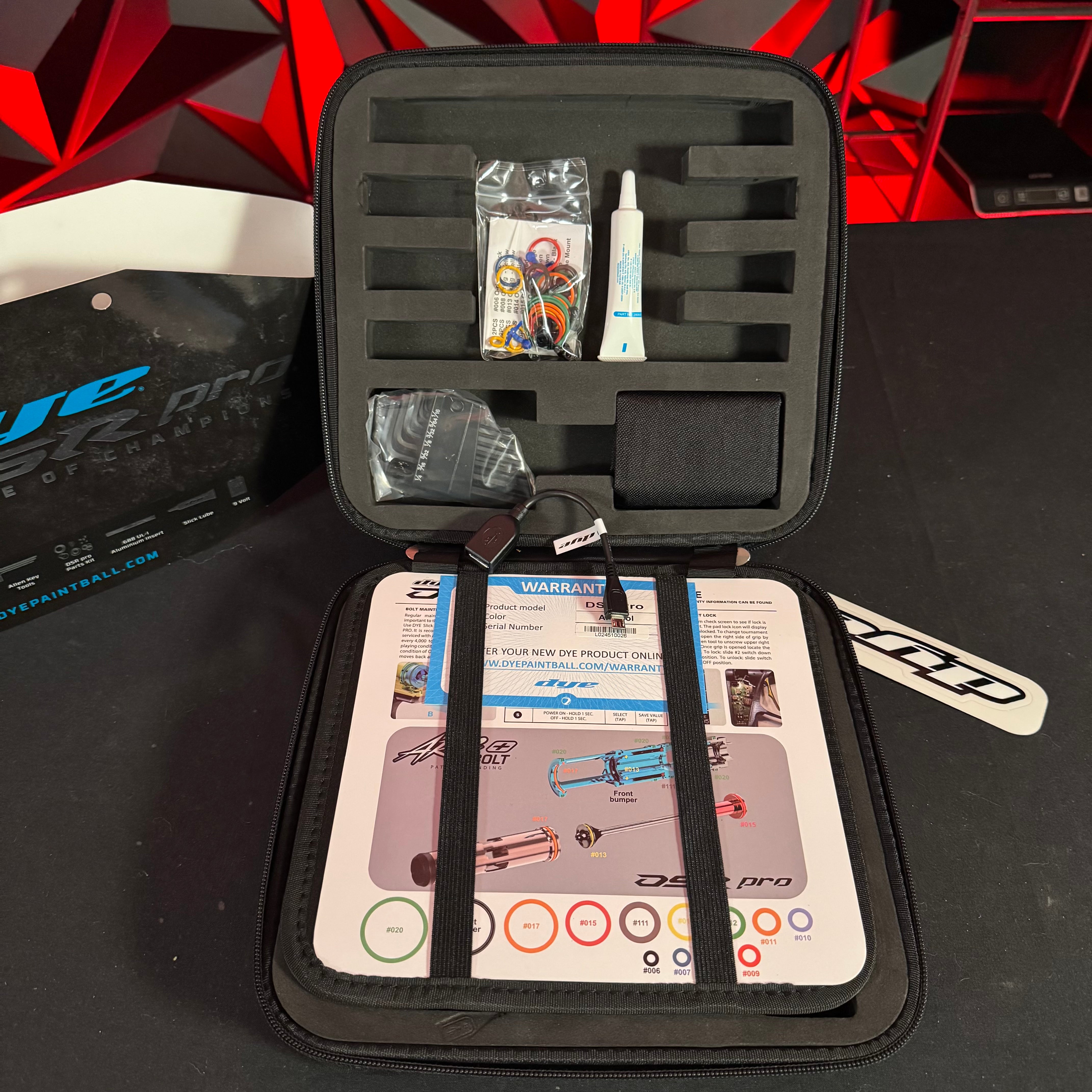 HARD FOAM CASE: Features an EVA foam lining for secure protection of the DSR Pro. DYE Slick Lube Advanced, DSR Pro parts kit, quick-start guide, DYE Core Allen key set, 9-bolt battery, barrel sock and .688 UL-i aluminum insert are included with marker.