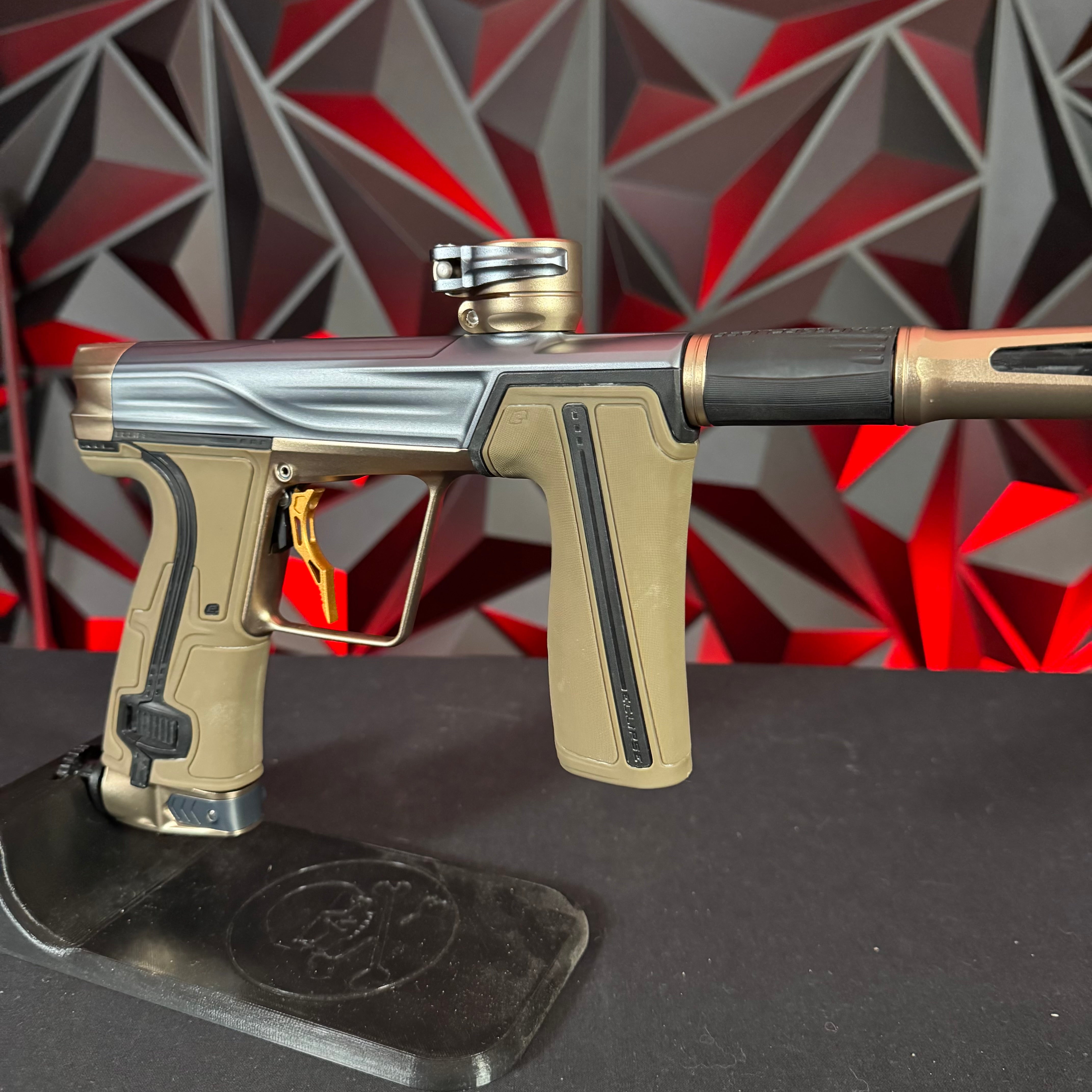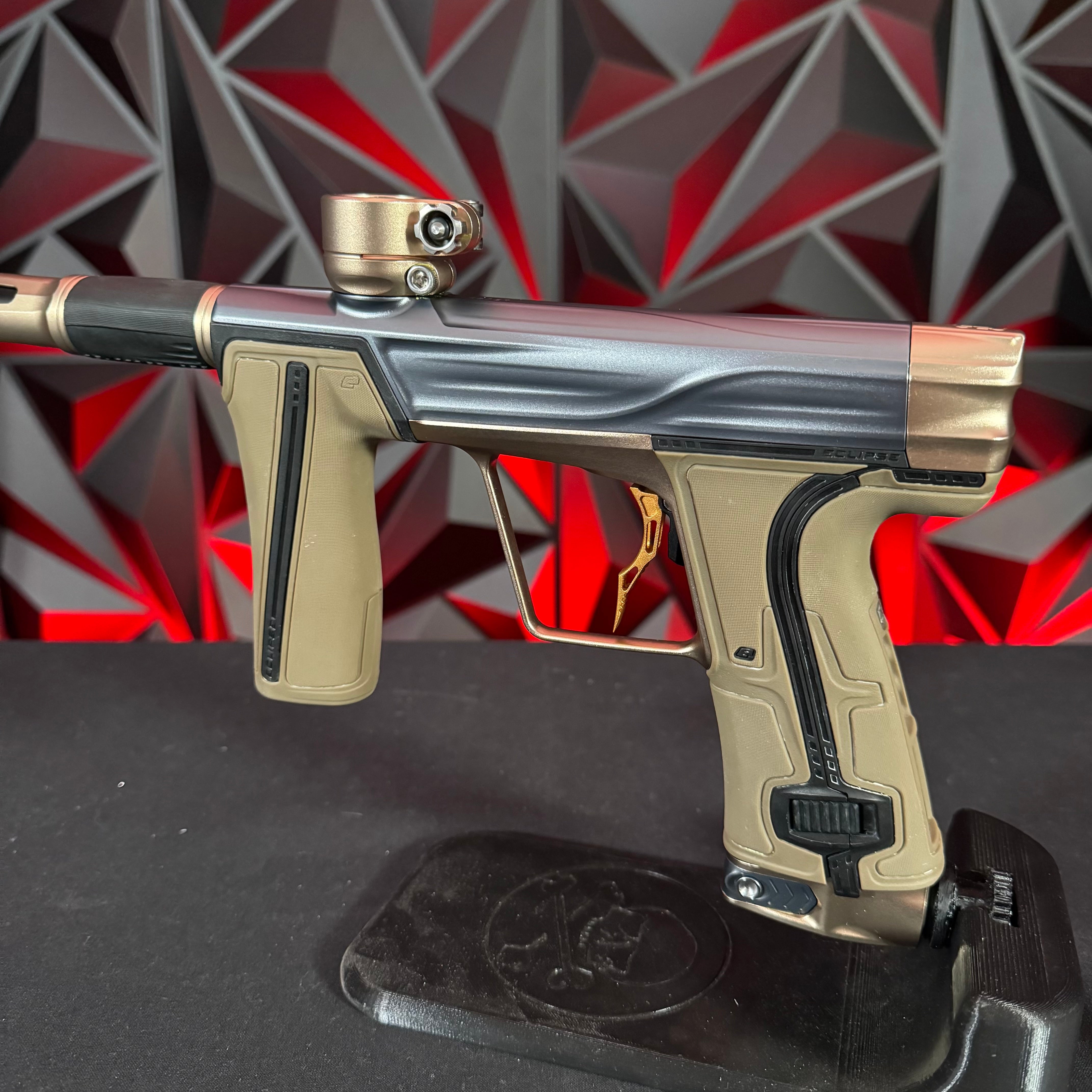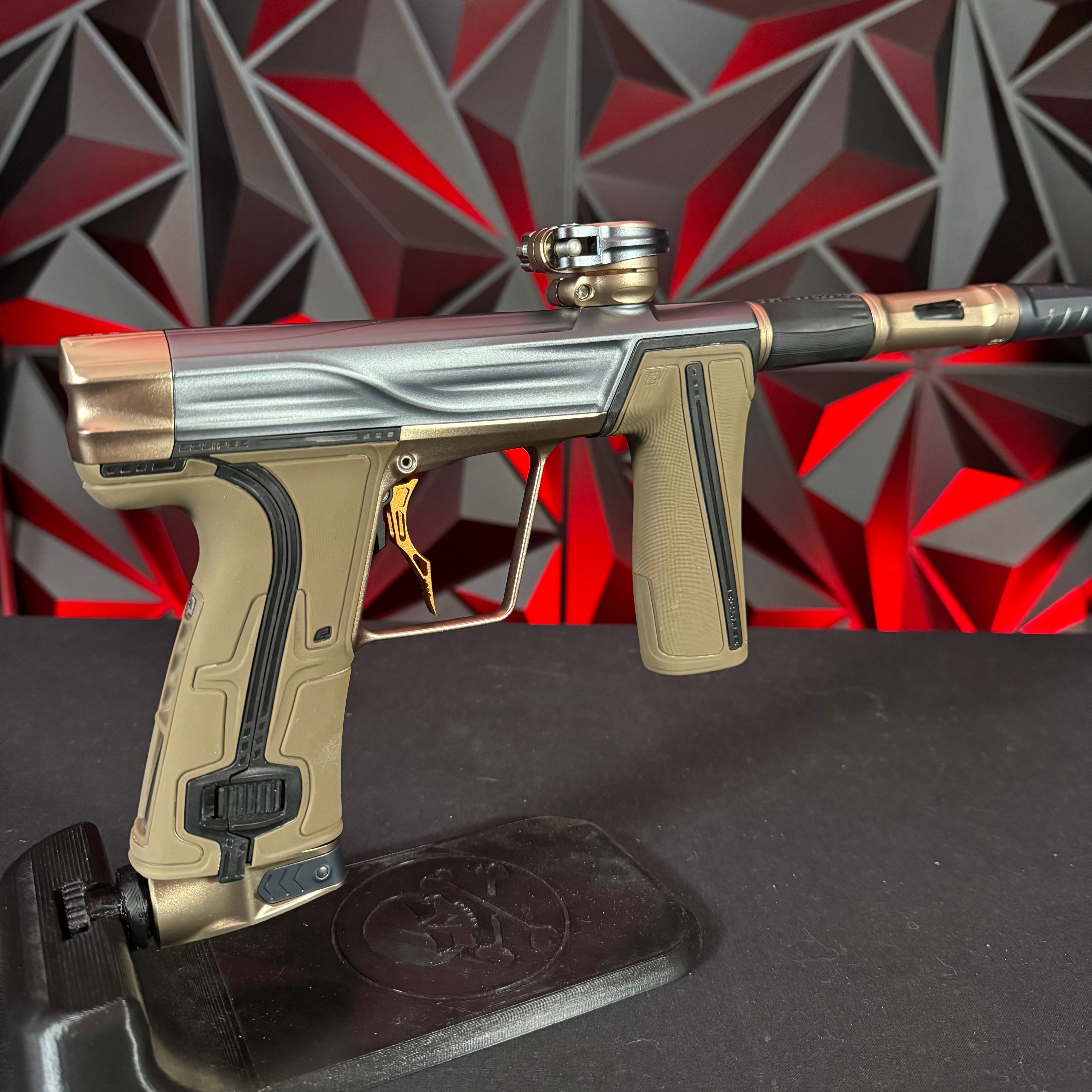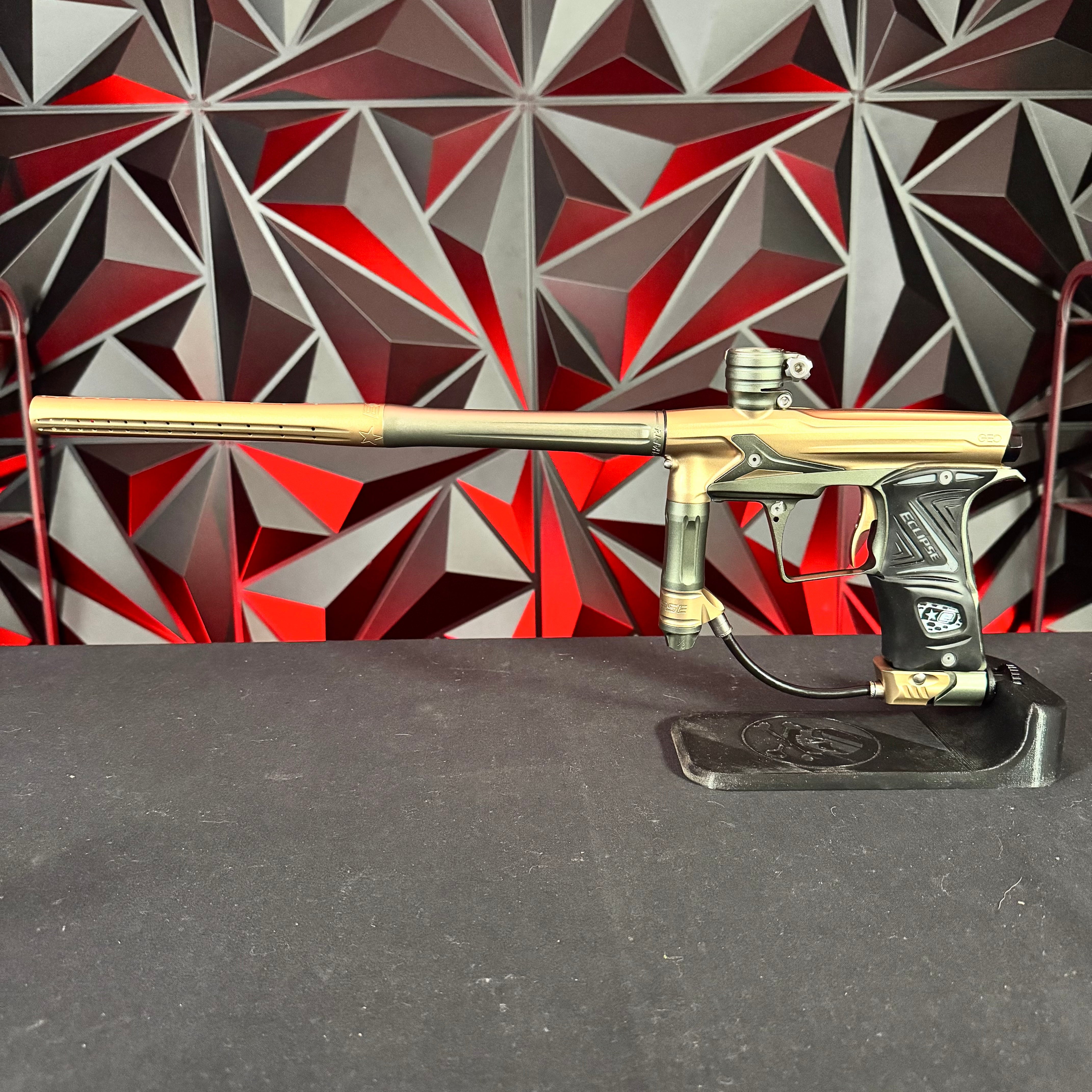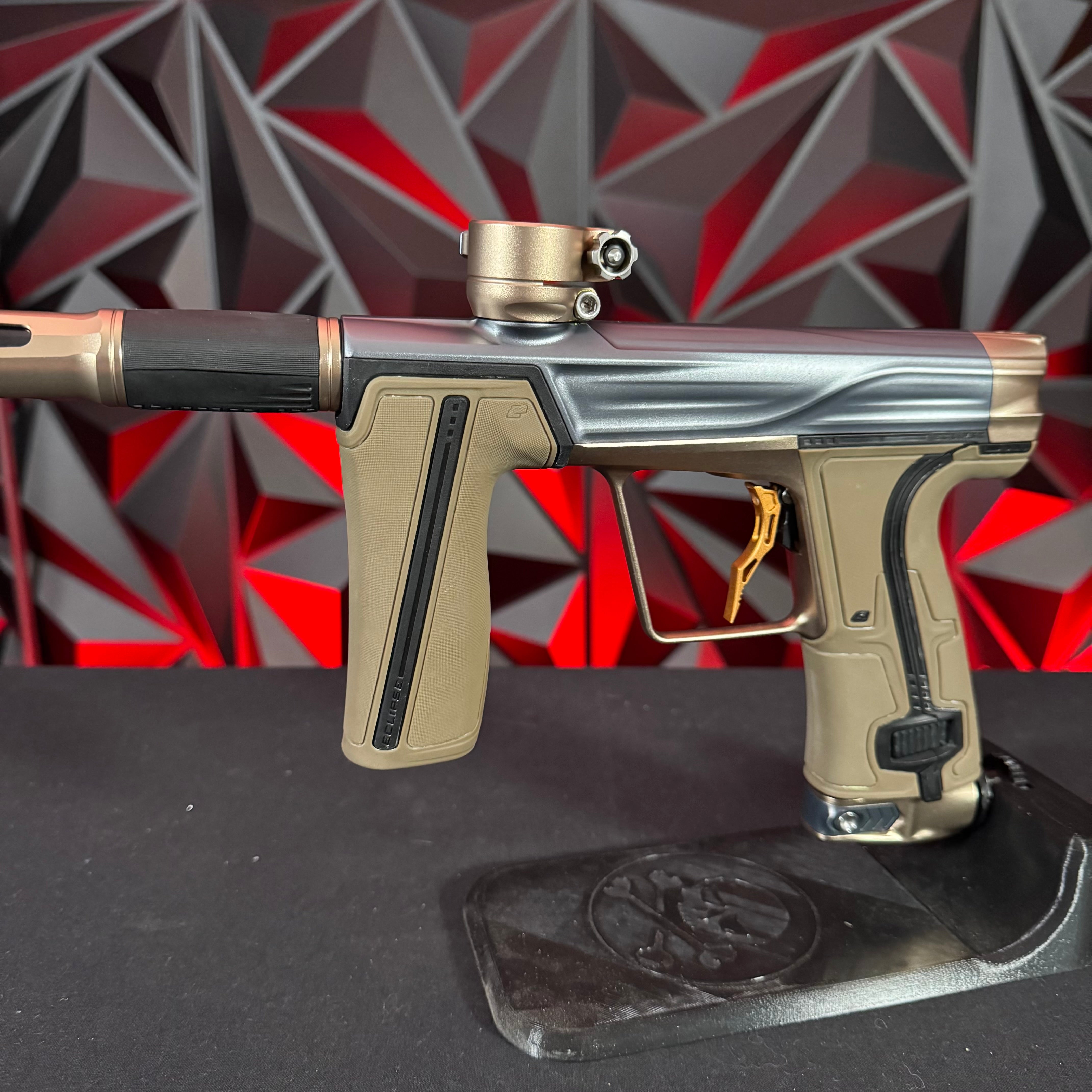Used Planet Eclipse Geo R5 Paintball Gun - Graphite/Sandstone w/ Gold Deuce Trigger & FDE Grips