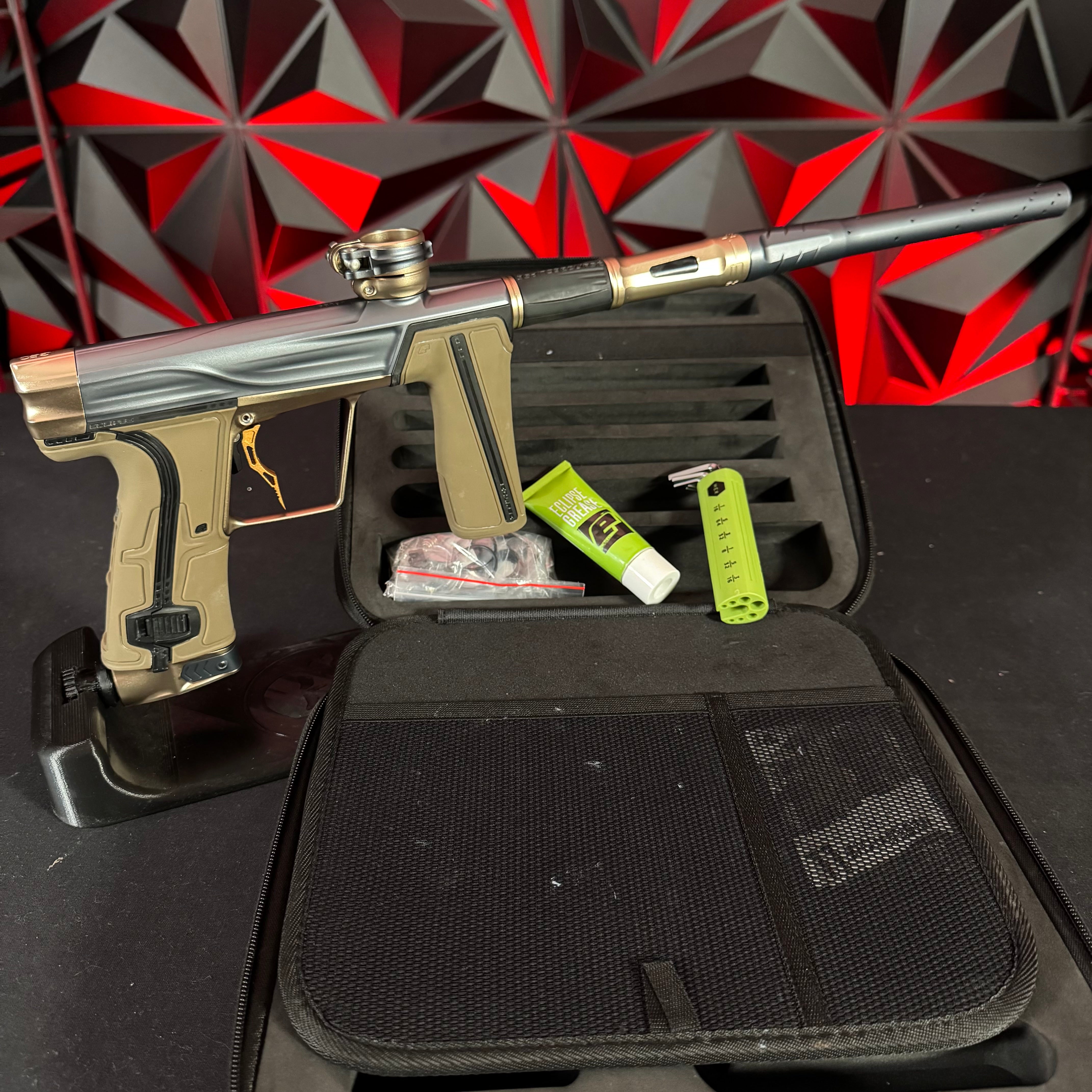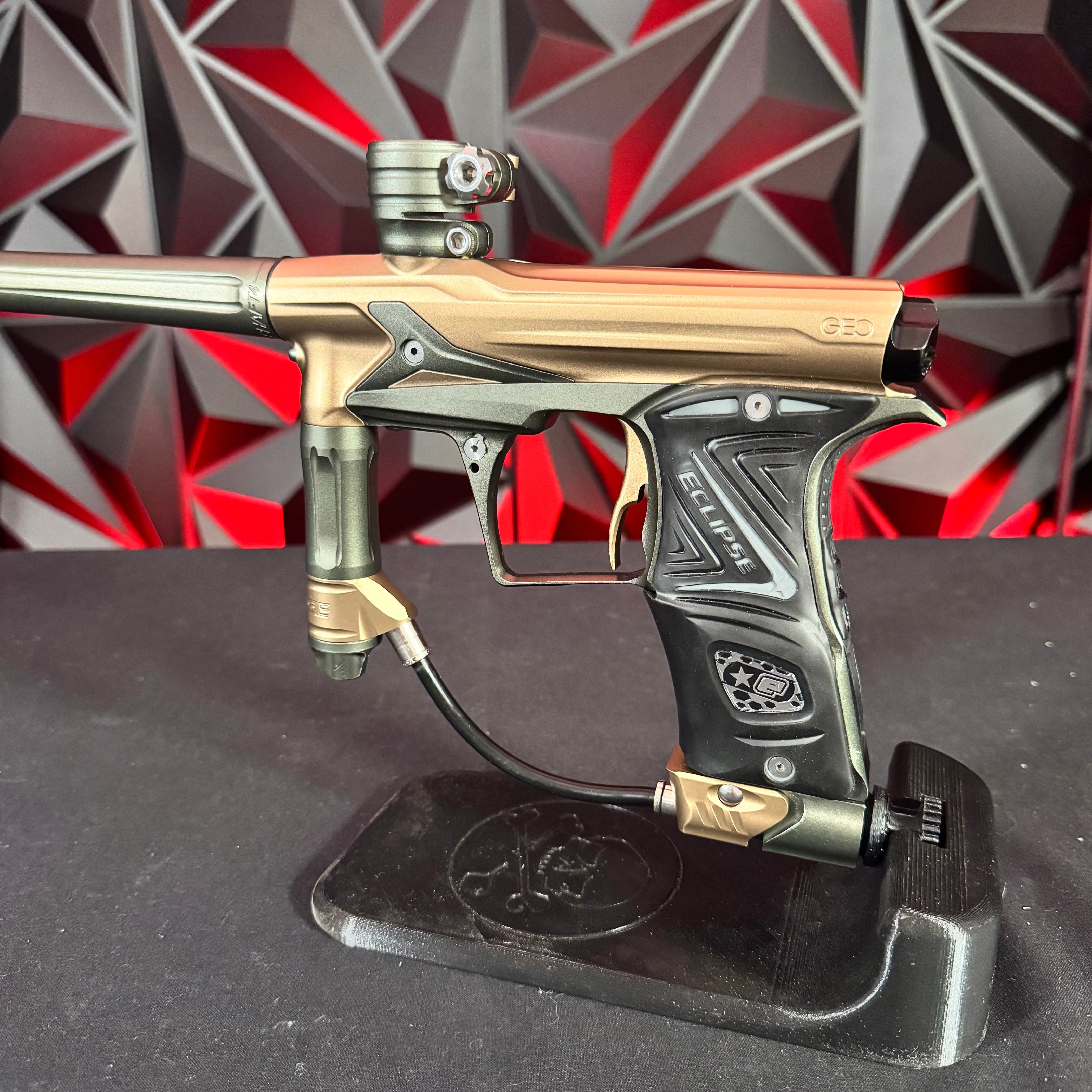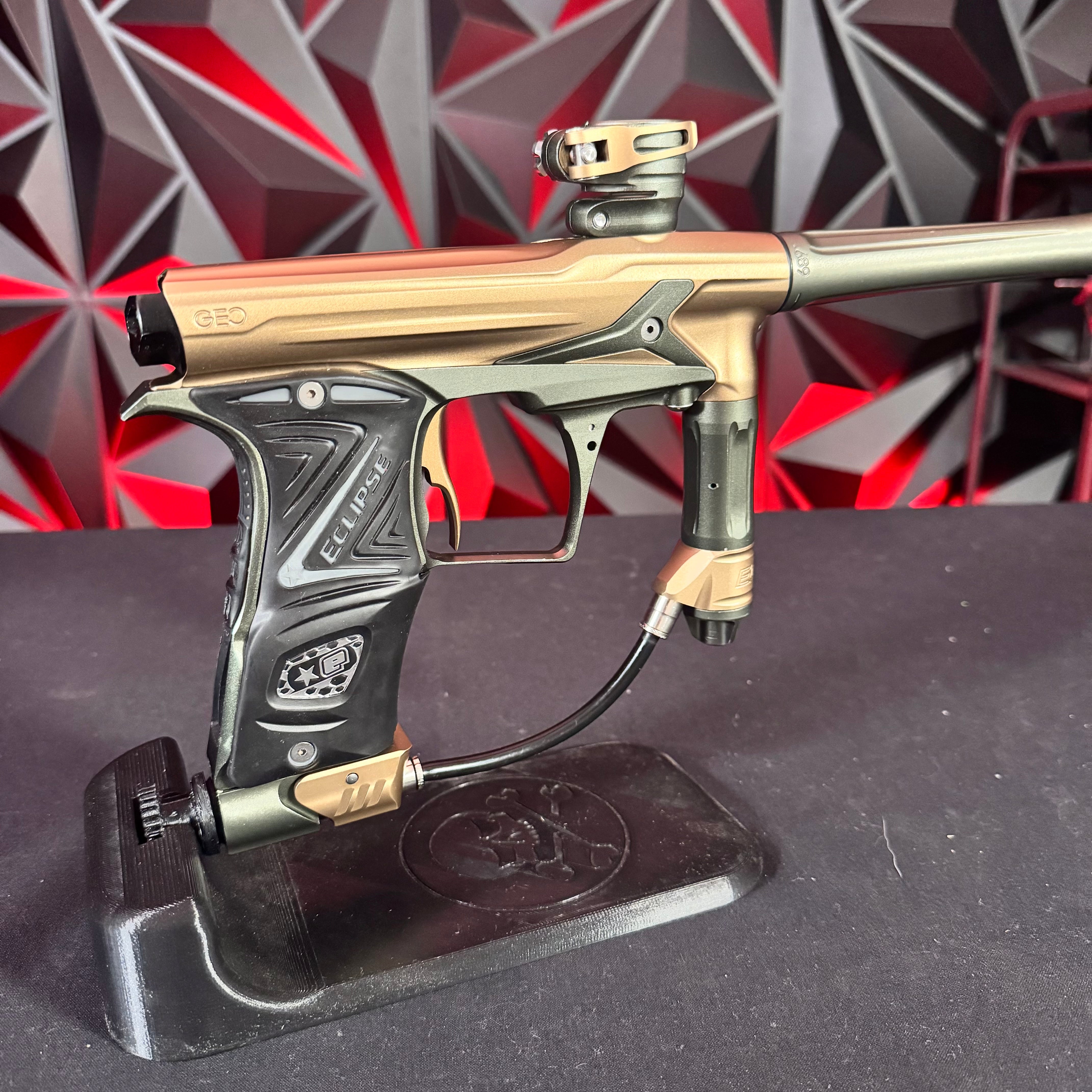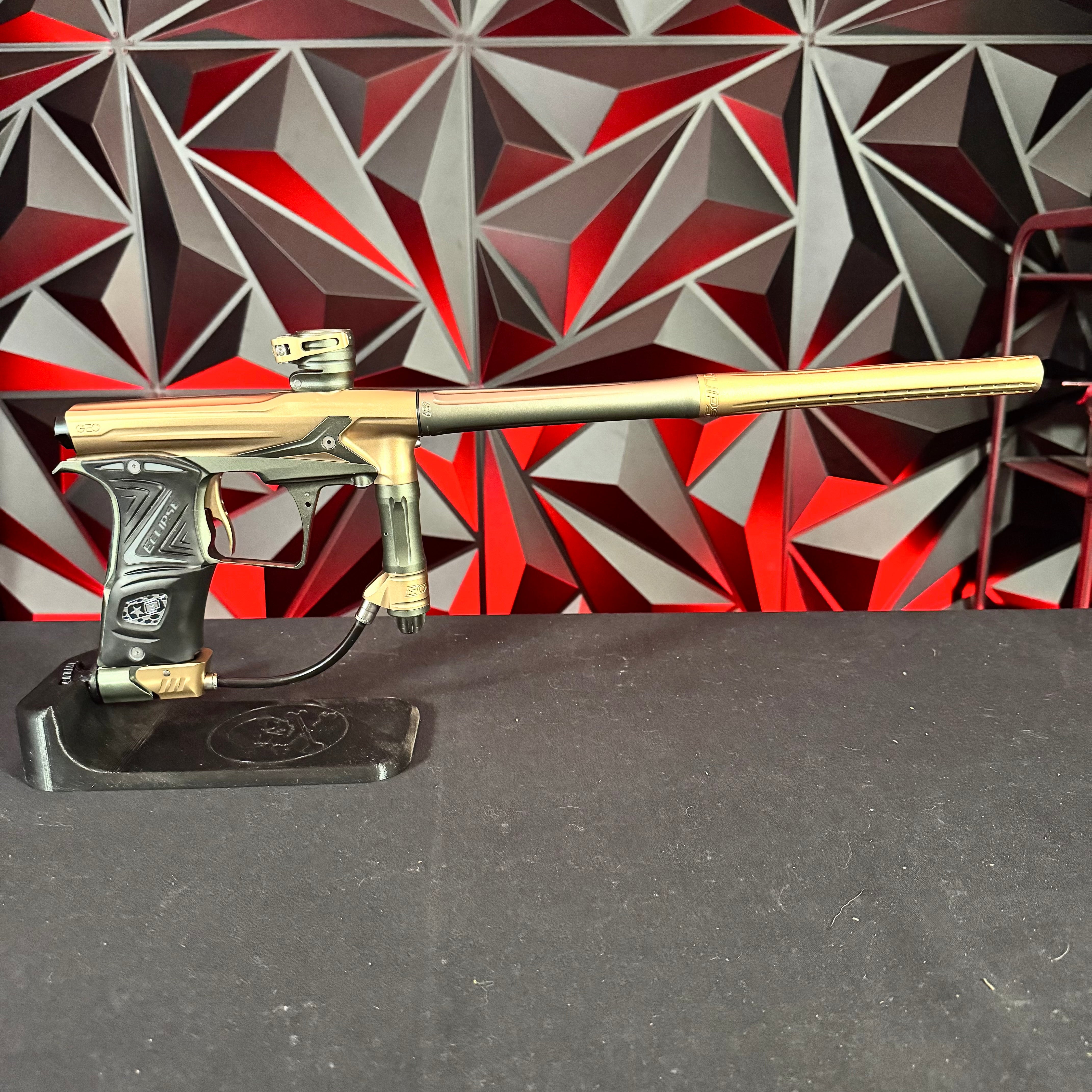 Used Planet Eclipse Geo R5 Paintball Gun - Graphite/Sandstone w/ Gold Deuce Trigger & FDE Grips