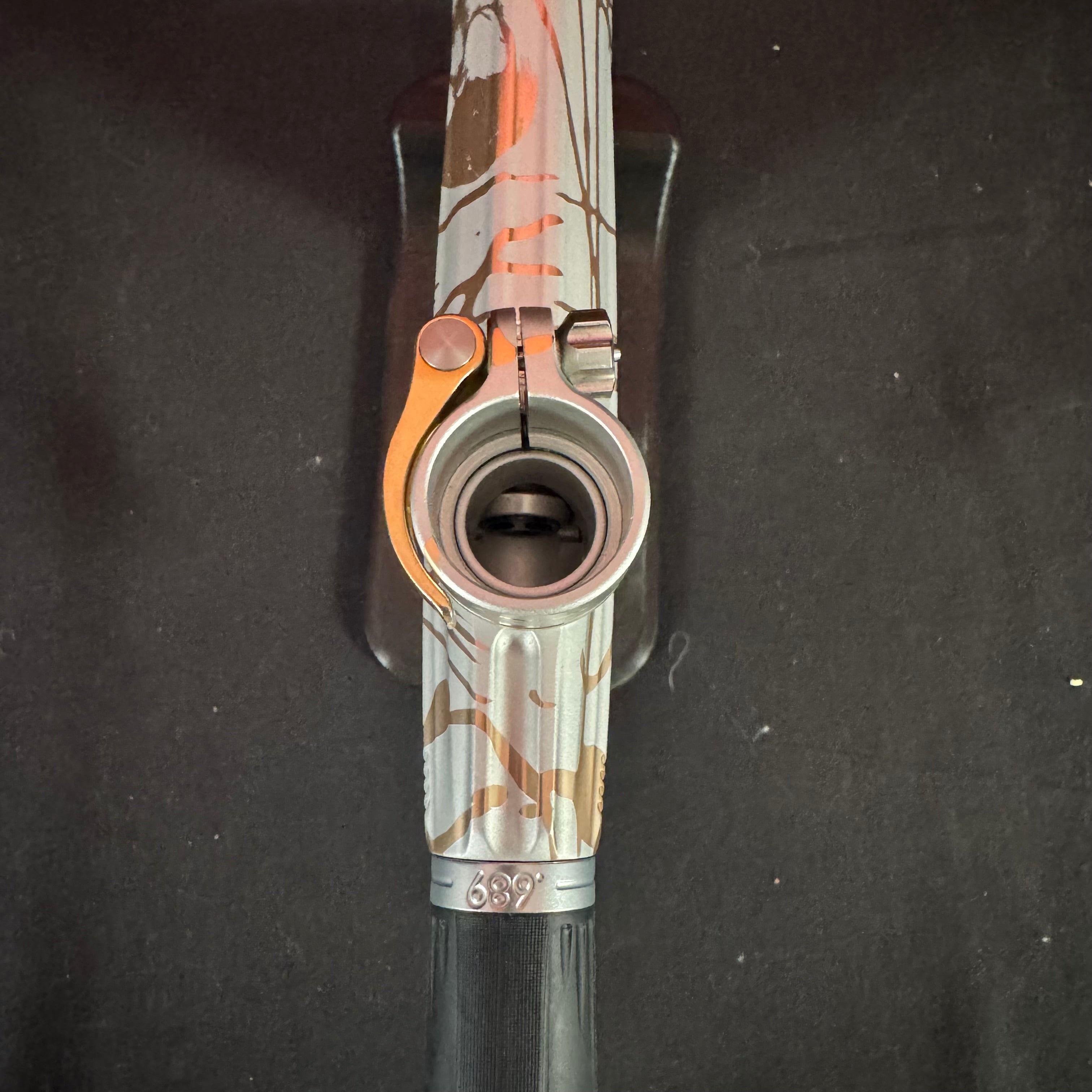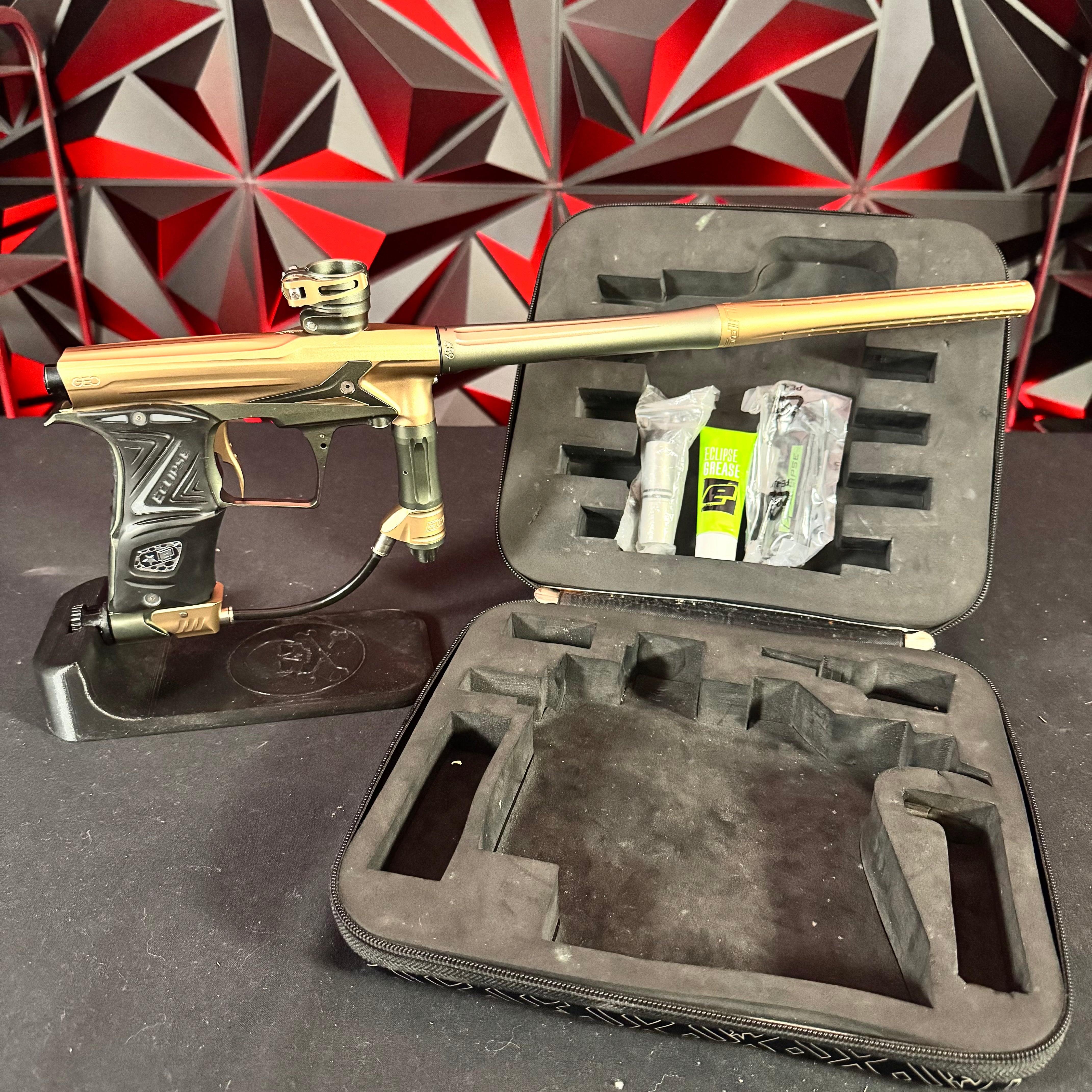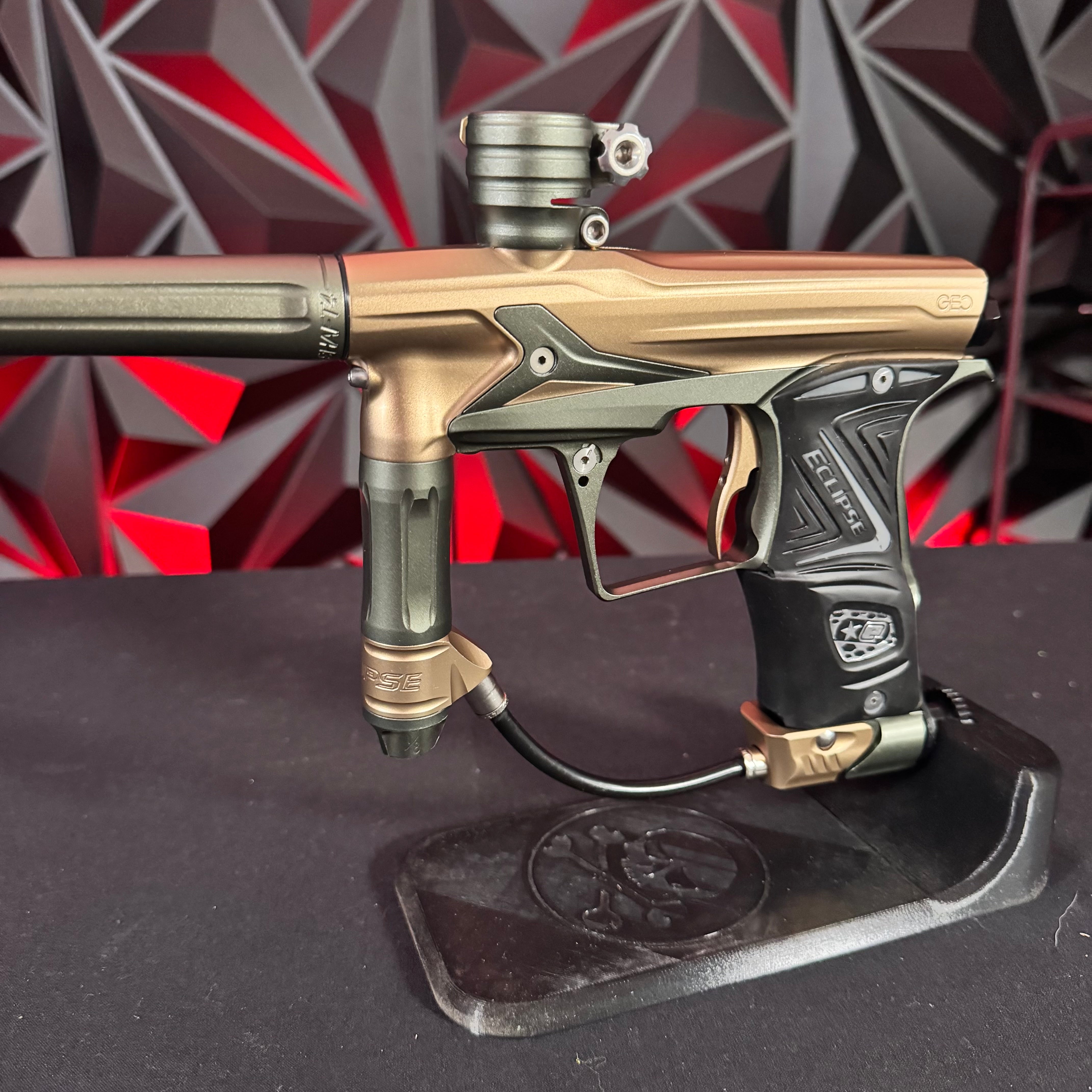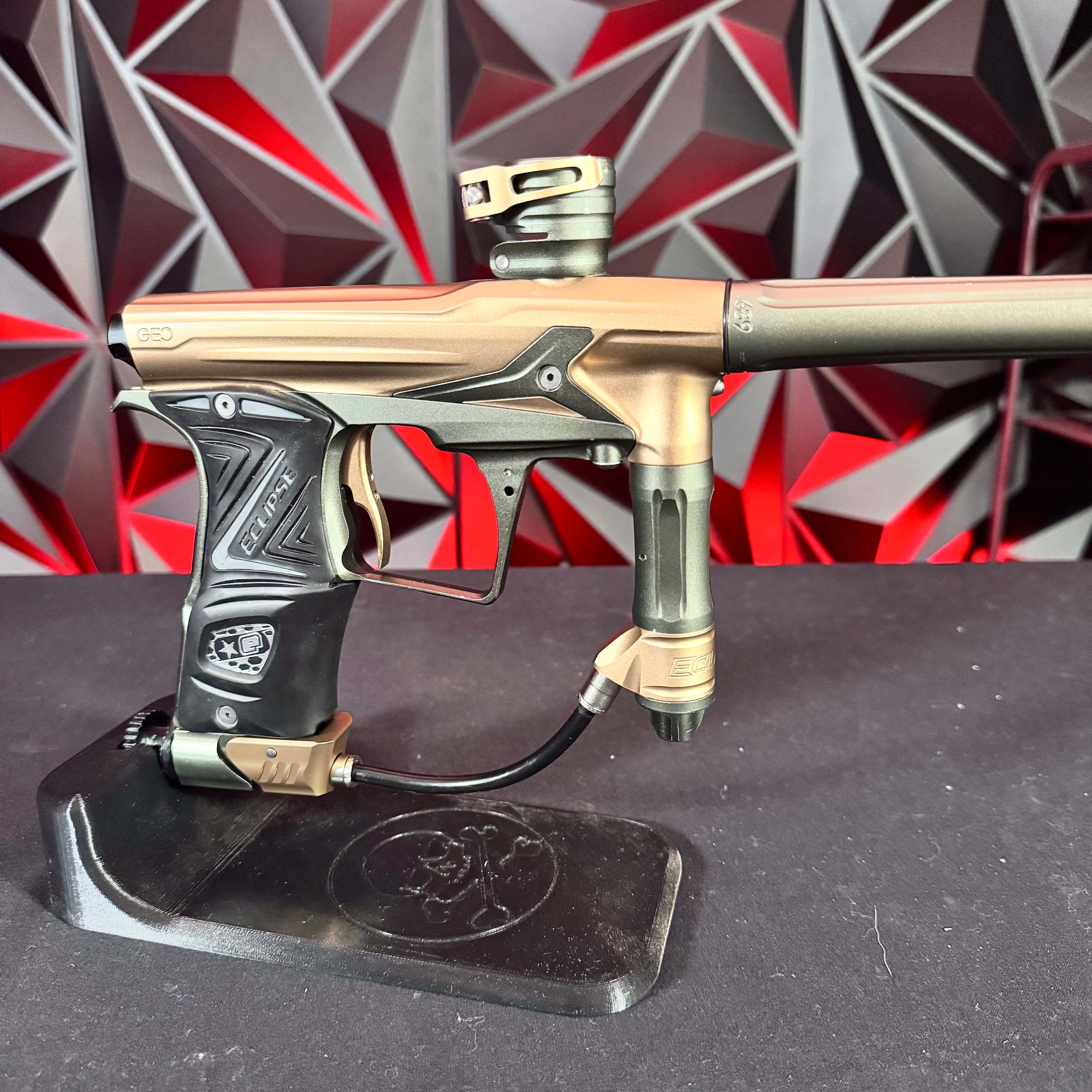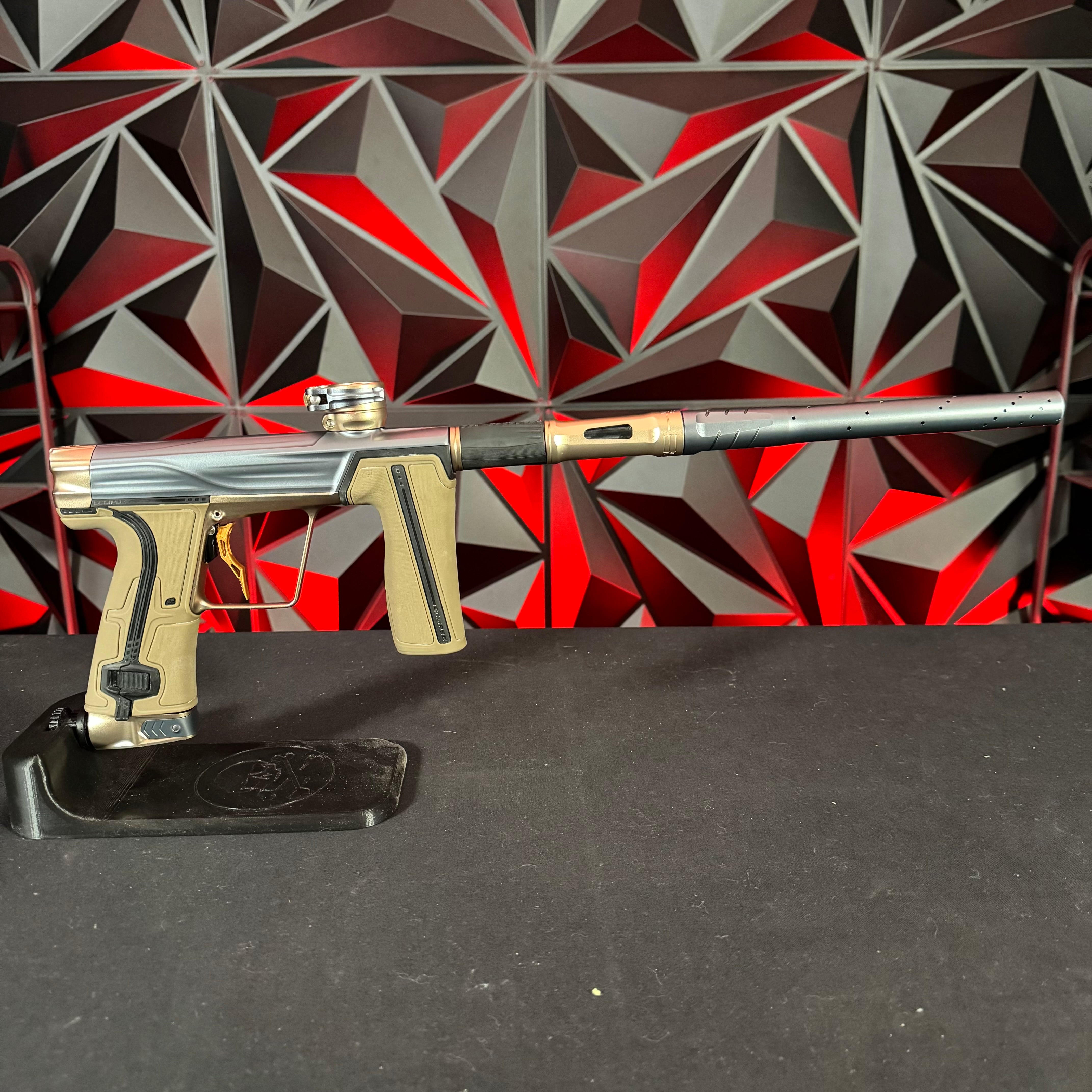 Used Planet Eclipse Geo R5 Paintball Gun - Graphite/Sandstone w/ Gold Deuce Trigger & FDE Grips
