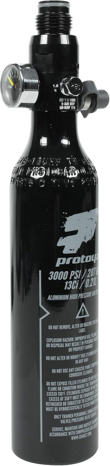 The Protoyz 13ci 3000 psi air tank features a high quality regulator with dual burst discs and great air flow. The aluminum cylinder is DOT rated for 3000 psi with an output pressure of 800 psi.