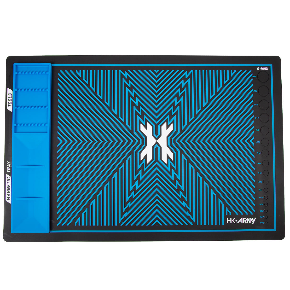 Quit damaging and losing parts while working on your marker with an HK Army MagMat Magnetic Tech Mat. The MagMat is built of heavy and durable yet flexible rubber material. It stays in place where you set it down without sliding. The ridged tool tray, Magnetic parts tray and raised border keep small parts like screws, springs and ball bearings from rolling away onto the floor or ground. The raised logo grips your marker without scratching for a safe and secure work surface. An O-Ring Gauge molded into the surface takes the guesswork out of quickly sizing your different seals.
